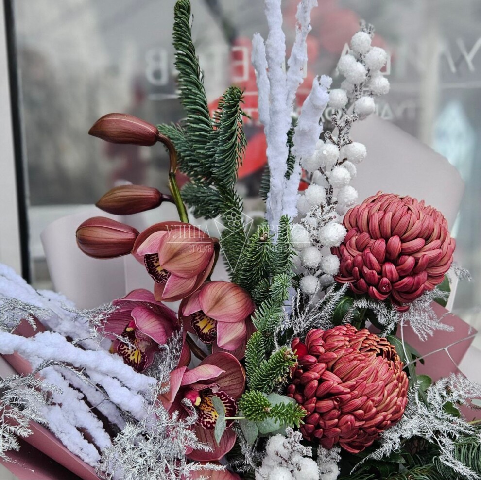 Букет «Айс кофе» — утончённая цветочная композиция, в которой переплетаются прохлада утреннего тумана и теплота бархатистого кофейного аромата. Нежные орхидеи, словно застывшие капли росы, привносят в ансамбль изысканную грацию и загадочность, а пышные хризантемы добавляют объём и мягкую текстуру, напоминая о бархатистой пенке свежесваренного напитка.