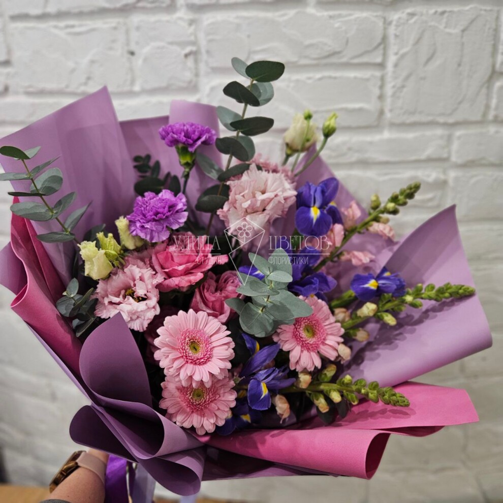 - Пионовидные розы, Герберы, Ирисы, Лизиантусы