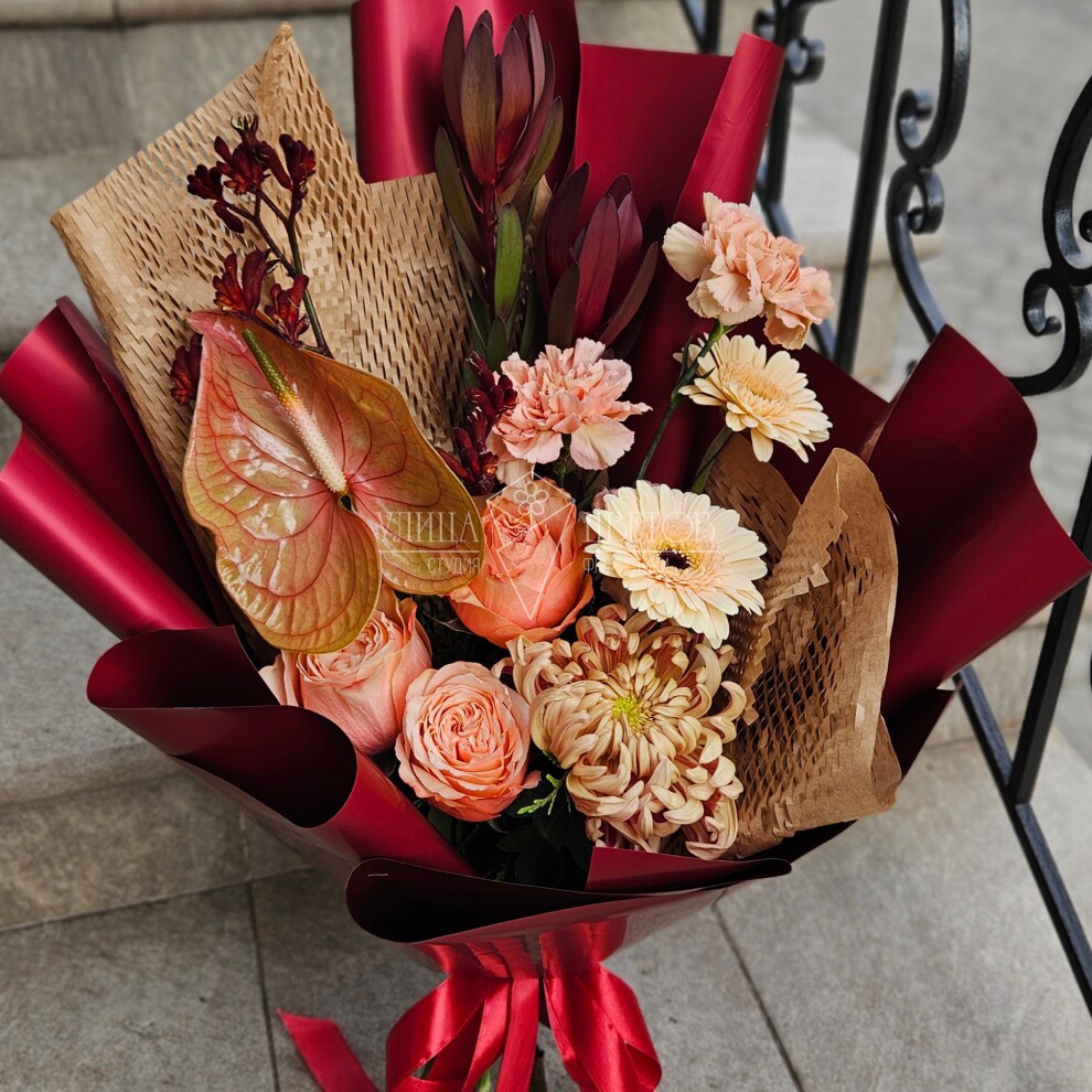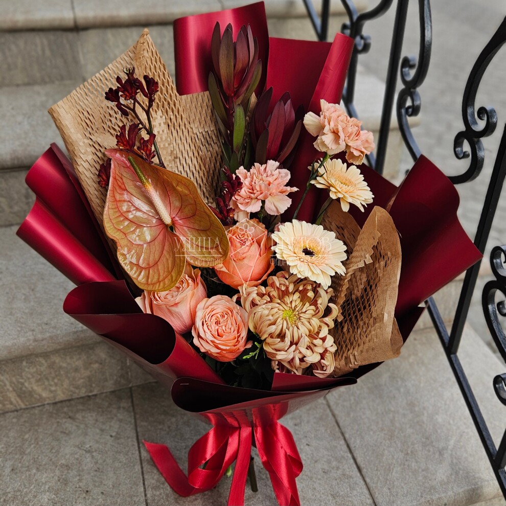 Букет «Магия осени» — это чарующая композиция, где пышные пионовидные розы сплетаются с яркими герберами, создавая неповторимую палитру осенних красок. Благородный антуриум привносит в букет нотку экзотики, а изящные диантусы добавляют композиции утончённости и элегантности. Каждый цветок в этой удивительной аранжировке словно рассказывает свою историю, погружая получателя в атмосферу тёплого осеннего дня и даря незабываемые эмоции.