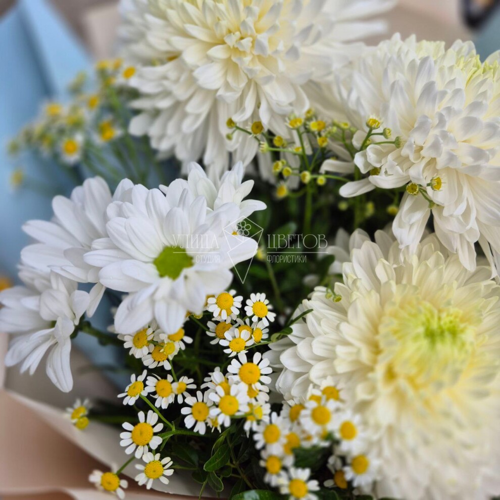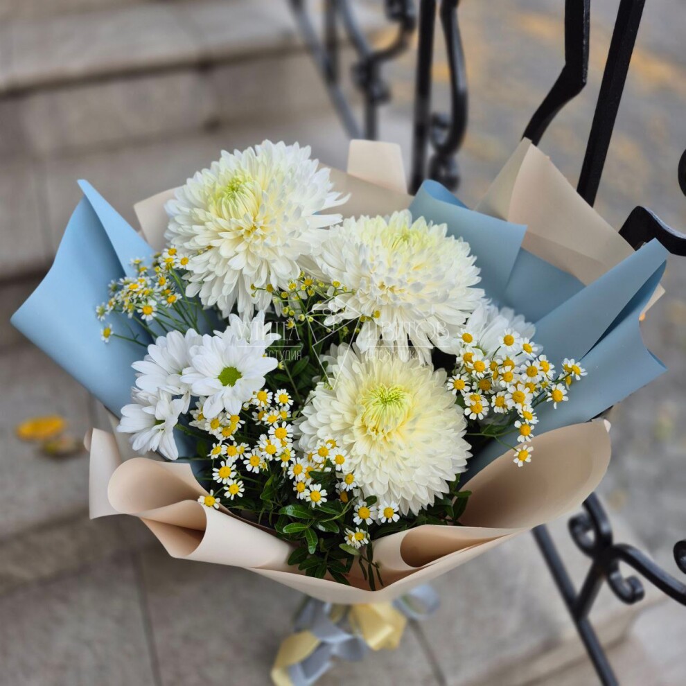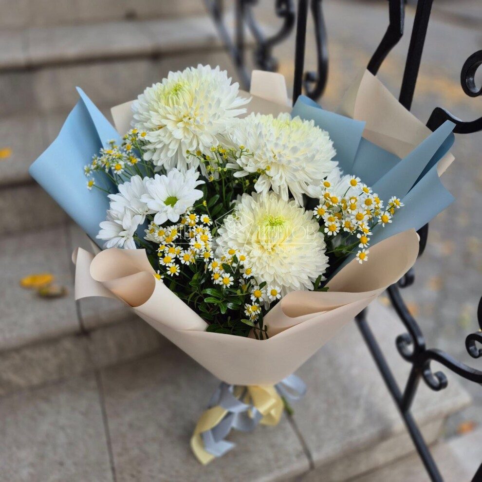 Букет «Милые хризантемы» — это воплощение осеннего очарования и природной нежности. Нежные хризантемы, словно маленькие солнышки, наполняют композицию теплом и уютом, а изящная маттиола добавляет букету особое очарование и лёгкость. Каждый цветок в этой гармоничной композиции излучает радость и дарит тёплые чувства, создавая атмосферу безмятежного осеннего дня. Этот букет станет прекрасным подарком для тех, кто ценит природную красоту и искренние эмоции.