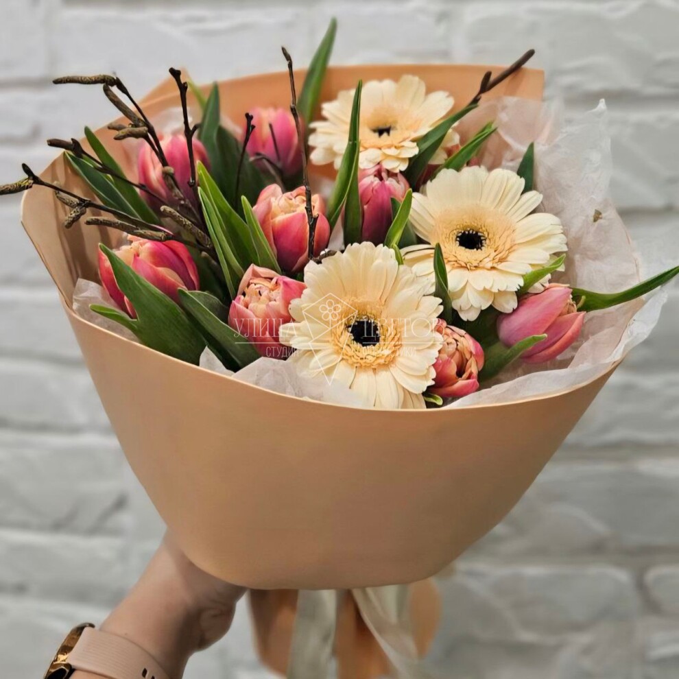 Букет «Намек на весну» — воплощение пробуждающейся природы в изящной цветочной композиции. Нежные герберы и яркие тюльпаны сплетаются в гармоничный ансамбль, наполняя пространство свежестью и радостью. Этот букет перенесёт вас в атмосферу тёплых весенних дней, подарит заряд позитива и станет прекрасным подарком для близких. Позвольте весне войти в ваш дом с этим очаровательным букетом!