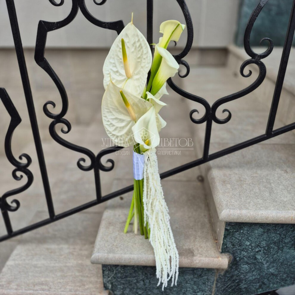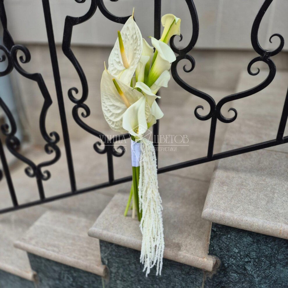 Изящный букет невесты «Антуриумы и каллы» — гармония элегантности и страсти. Нежные каллы в сочетании с яркими антуриумами создают утончённый образ, подчёркивающий красоту и женственность невесты. Идеальный выбор для тех, кто ценит изысканность и современный стиль.