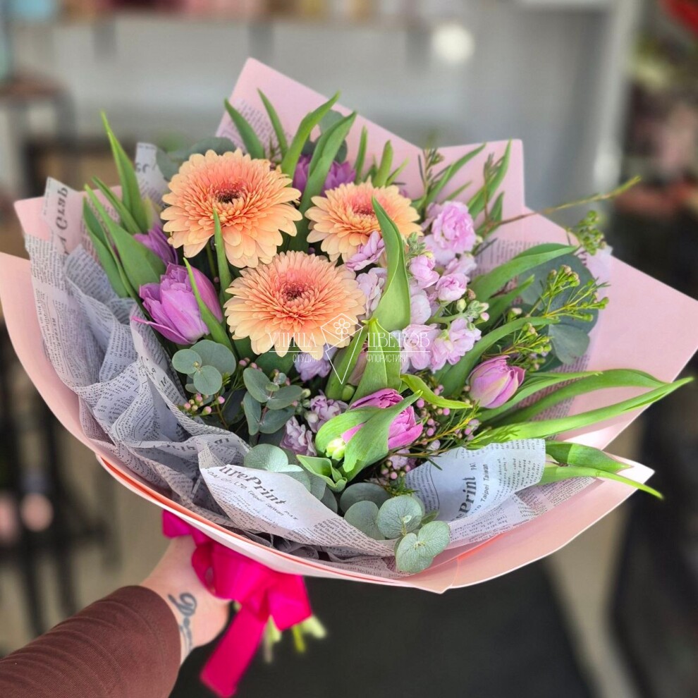 Букет «Шёпот весны» — нежное воплощение пробуждающейся природы в цветочной композиции. Яркие герберы в сочетании с изящными тюльпанами создают гармоничный ансамбль, наполненный светом и свежестью. Лёгкость и утончённость букета словно передают тихий шёпот весеннего ветра, а сочные оттенки цветов поднимают настроение и дарят ощущение приближающегося тепла. Этот букет станет прекрасным подарком, чтобы выразить тёплые чувства и пожелать радости.