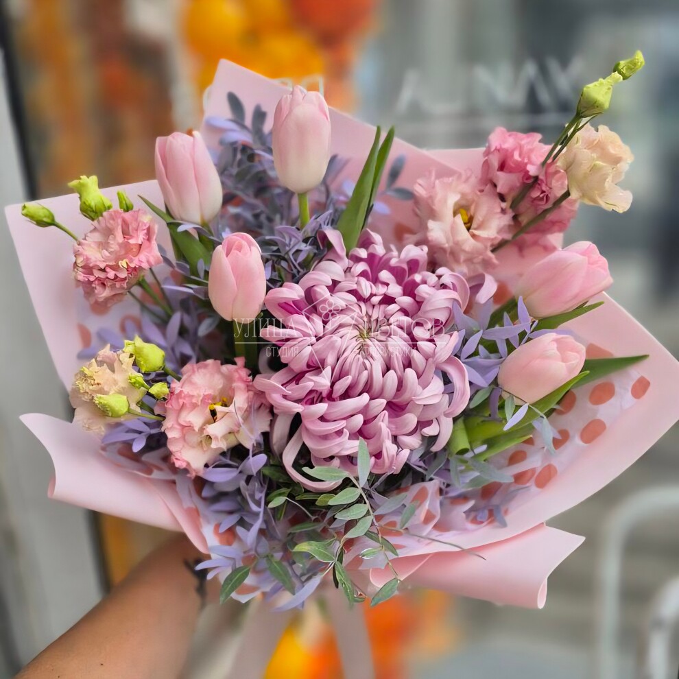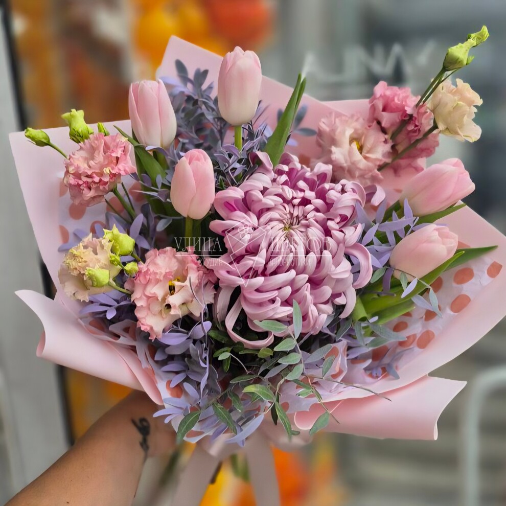 Букет «Свидание» — это романтичная история, рассказанная языком цветов. Нежные тюльпаны, словно первые лучи рассвета, переплетаются с изящными хризантемами, создавая атмосферу трепетного ожидания. Утончённые лизиантусы добавляют композиции особую чувственность и очарование, превращая каждый момент встречи в незабываемое событие. Этот букет — идеальное воплощение нежных чувств, способное передать всю гамму эмоций и создать неповторимую атмосферу романтического свидания.