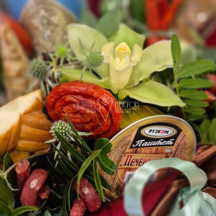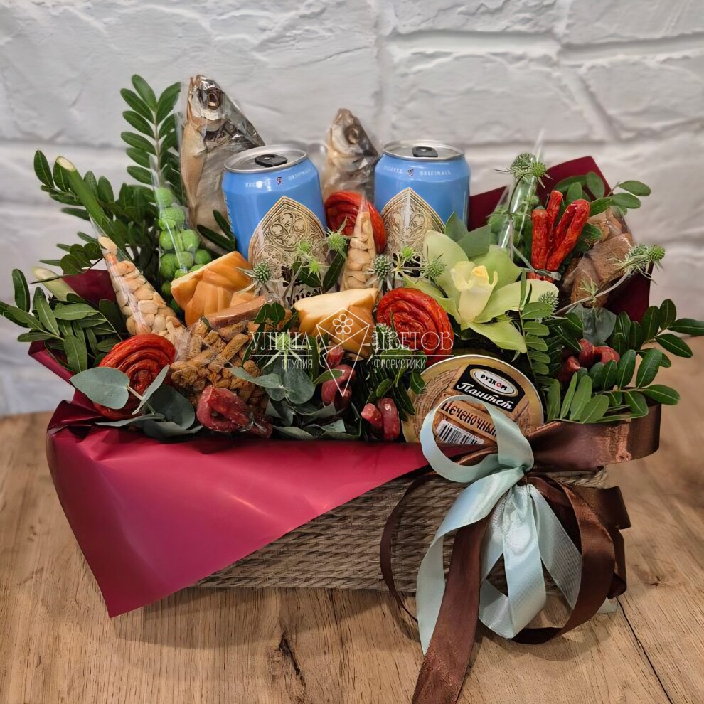 Обращаем ваше внимание, что мы не реализуем алкогольные напитки. Наша специализация — оформление и упаковка букетов для мужчин, на фото представлен пример оформления композиции. Вы можете дополнить композицию любым напитком, который привезёте с собой.