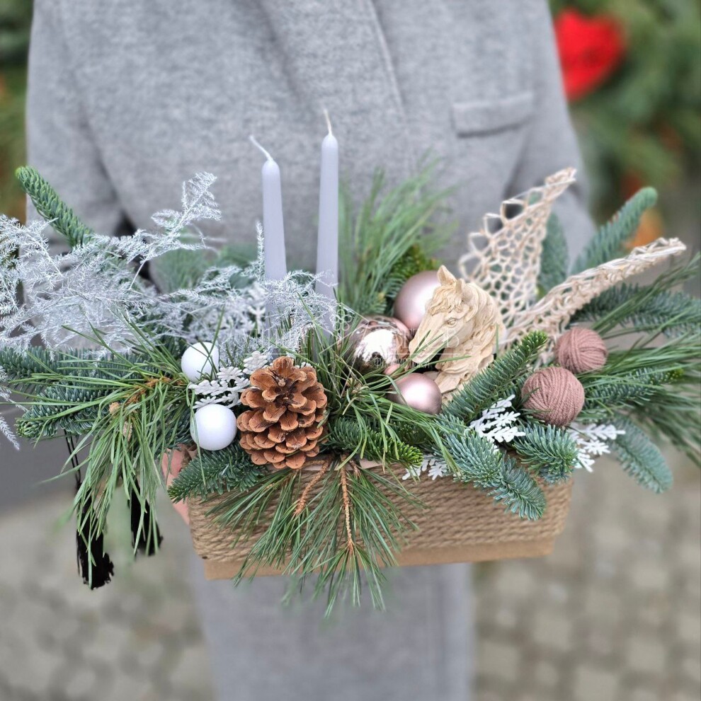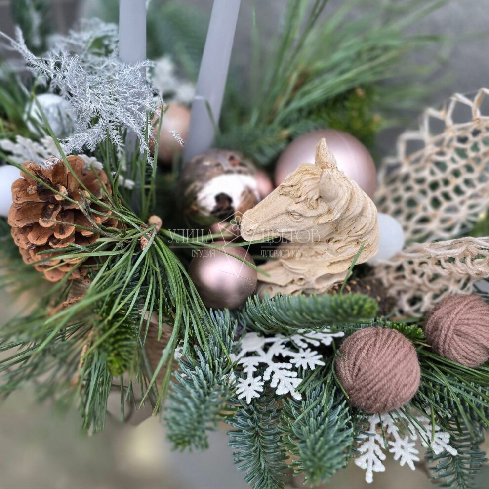 Композиция «Ход конём» — это новогодняя шахматная партия, где выигрывает красота и волшебство. В уютной корзине расположился пушистый натуральный лапник, словно заснеженное поле битвы, а среди его ветвей — блестящие новогодние шары, мерцающие свечи и главный герой композиции: декоративный конь, будто только что совершивший свой решительный ход.