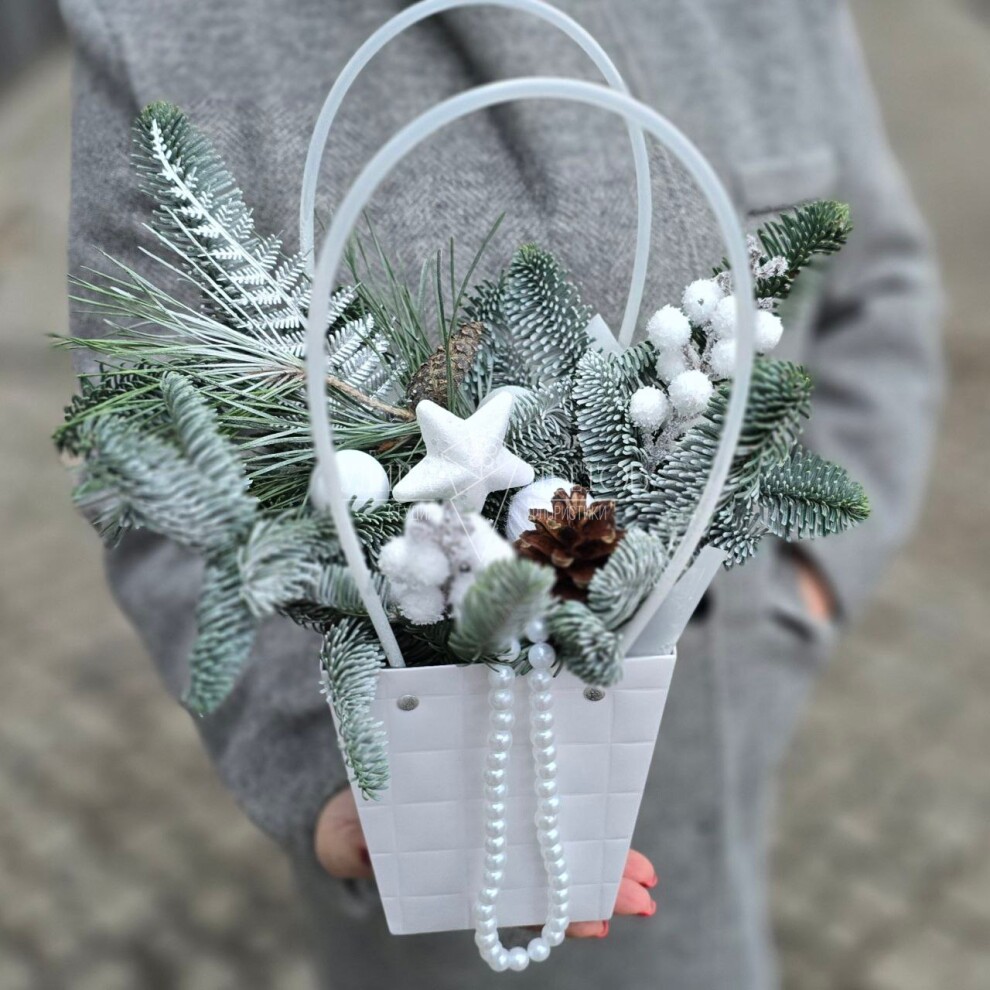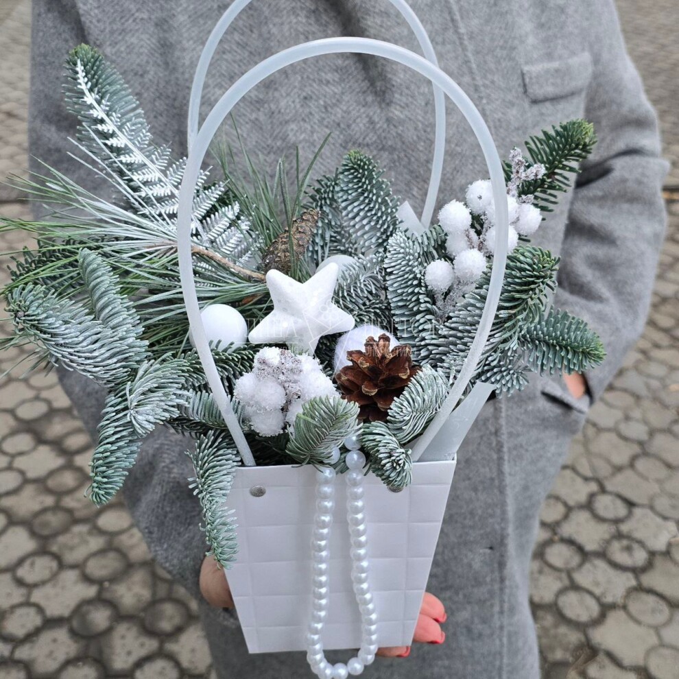 Новогодняя композиция «Жемчуг» — изысканное сочетание натурального лапника и деликатного декора. Нежные звёзды мягко переливаются, словно рассыпанный жемчуг, а уютный формат декоративной сумочки делает композицию универсальным украшением: её можно разместить на столе, полке или повесить на ёлку. Идеальный выбор для тех, кто ценит сдержанную праздничность и природную красоту.