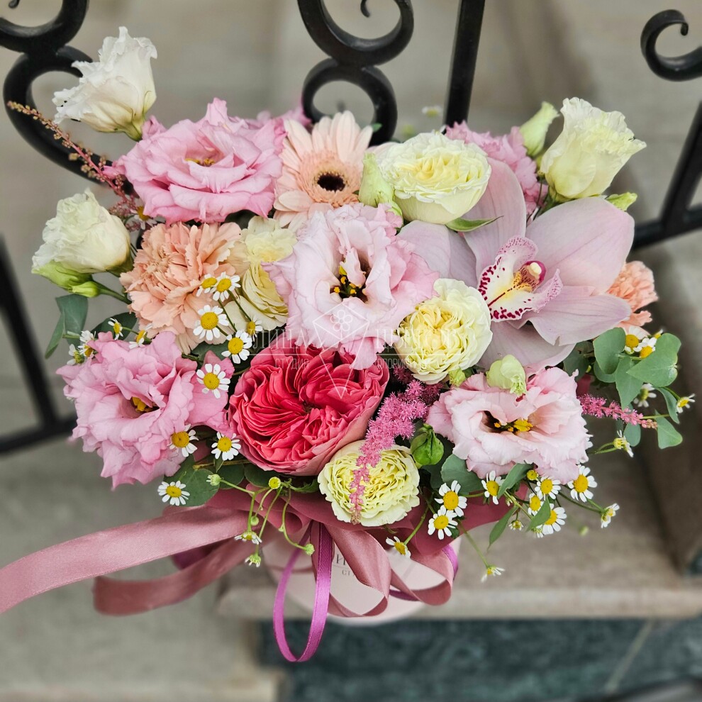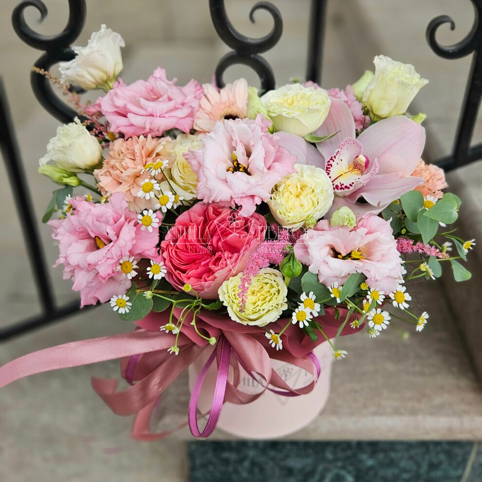 Шляпная коробка «Цветаева» — изысканная композиция, вобравшая в себя всю поэзию цветущего сада. Пионовидные и кустовые розы, орхидеи, лизиантусы, диантусы и матрекария сливаются в гармоничный ансамбль, где каждый цветок дополняет другой, словно строки в стихотворении.