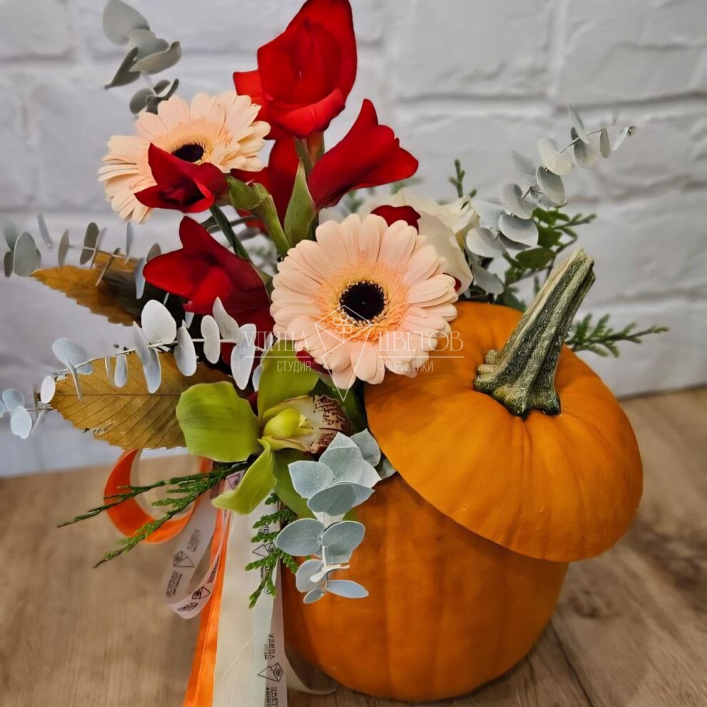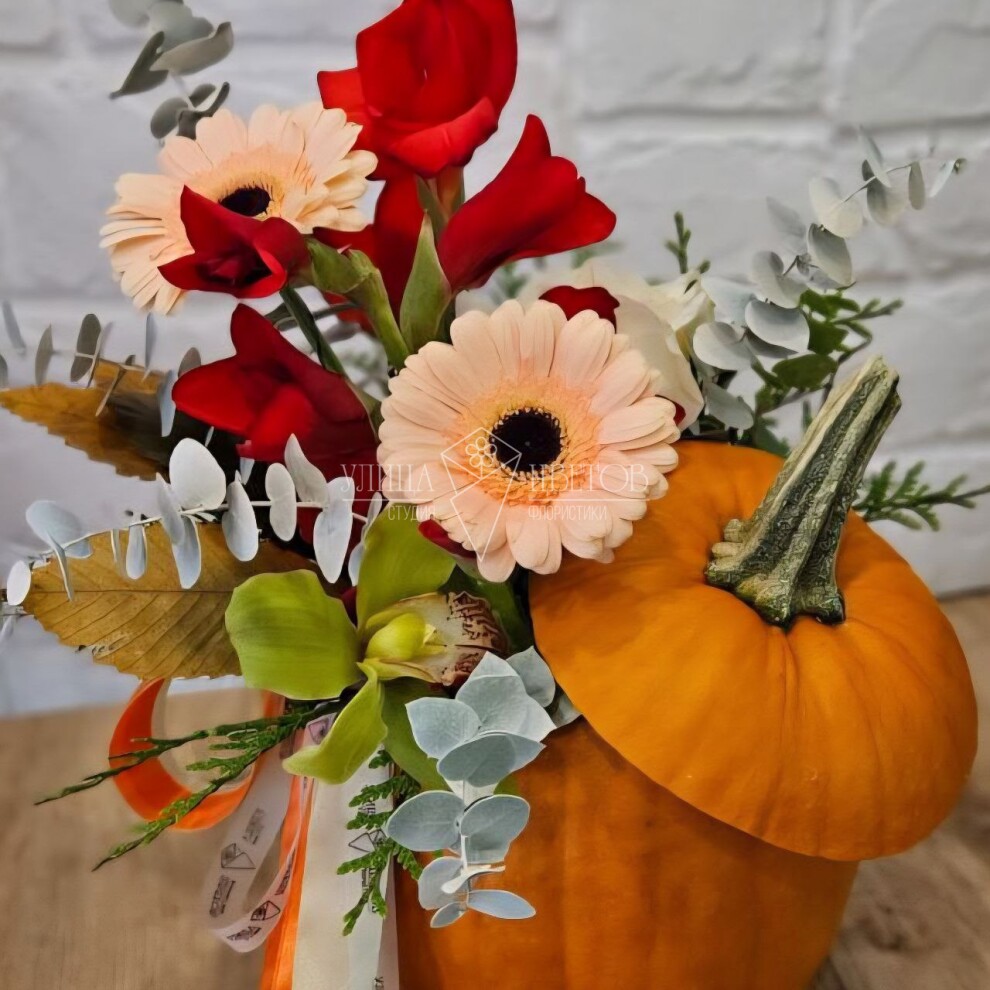 Композиция „Моменты октября“ подарит ощущение уютного октябрьского вечера. Герберы и орхидеи в обрамлении тыквы создают атмосферу тепла и безмятежности — как чашка горячего чая с видом на опавшие листья.