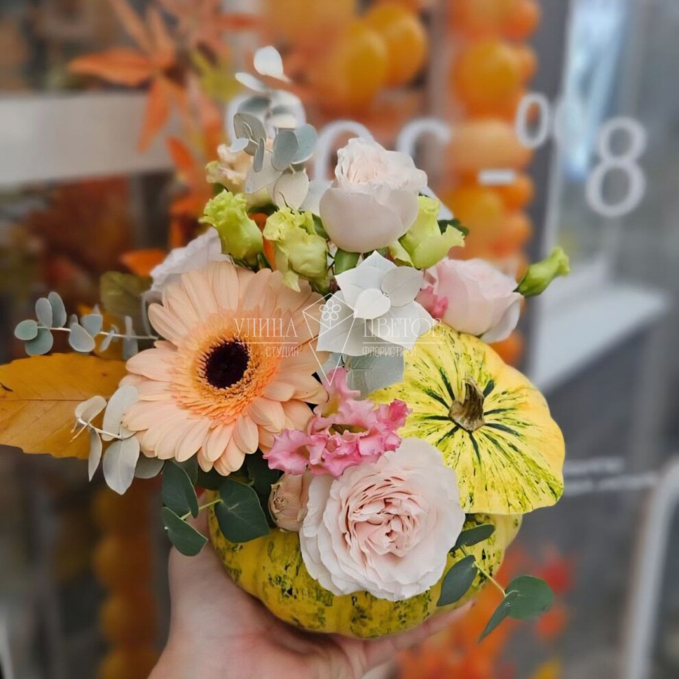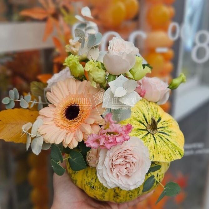В композиции „Тыковка“ каждая деталь дышит осенним очарованием. Кустовые розы и герберы, обрамлённые природной красотой тыквы, словно запечатлели краски бабьего лета — нежные, яркие, неповторимые